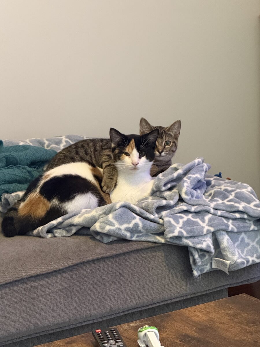“Needless to say, they are well loved,” says their adopter, Lindsay. Molly is SO affectionate and always in the mix chasing Hot Wheels with our kids, then curling up in my lap while I read. Frankie is incredibly gentle – she lets the kids pick her up but also enjoys her quiet time. She never lets us forget when it’s dinner time!”